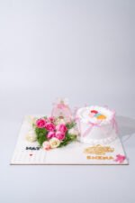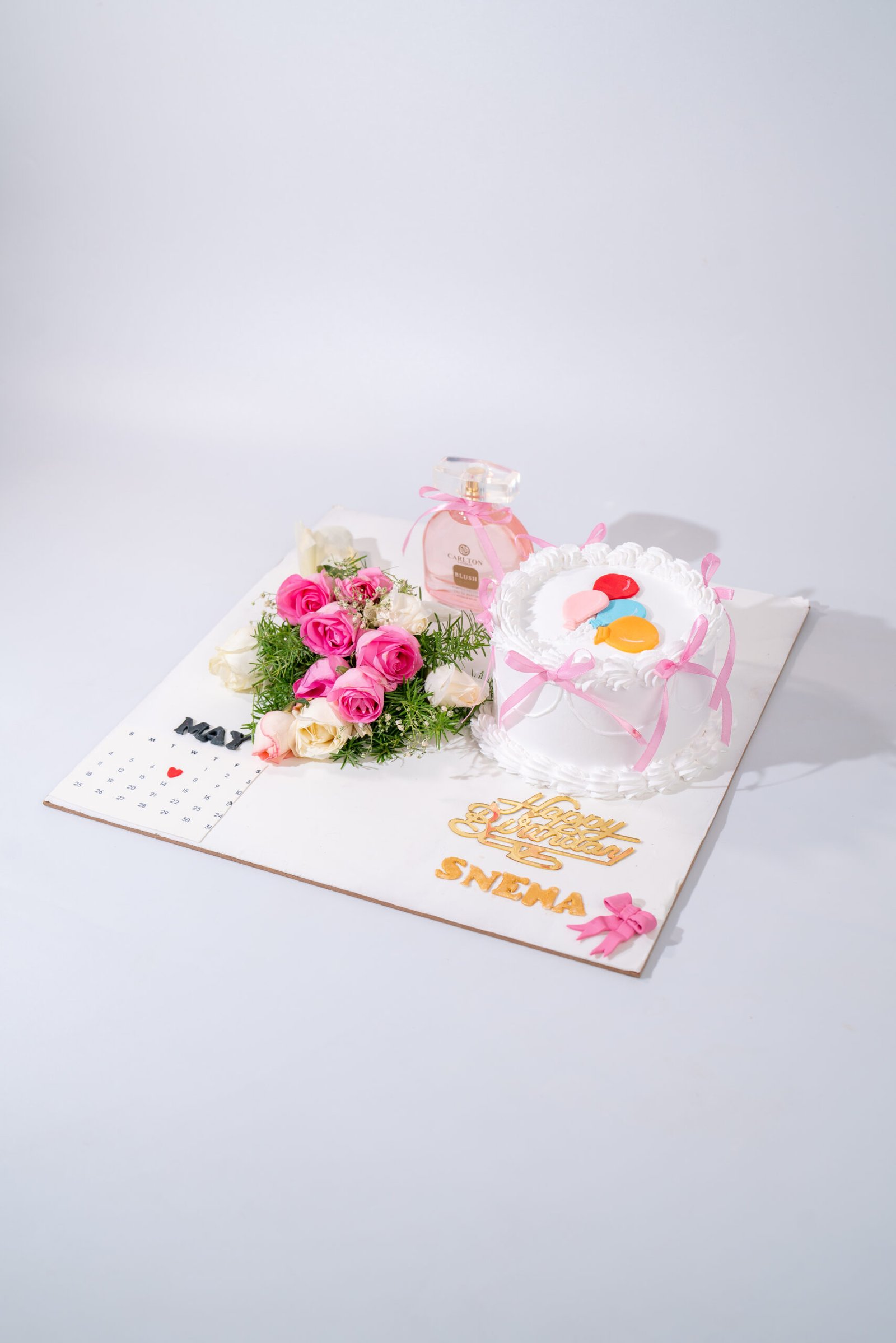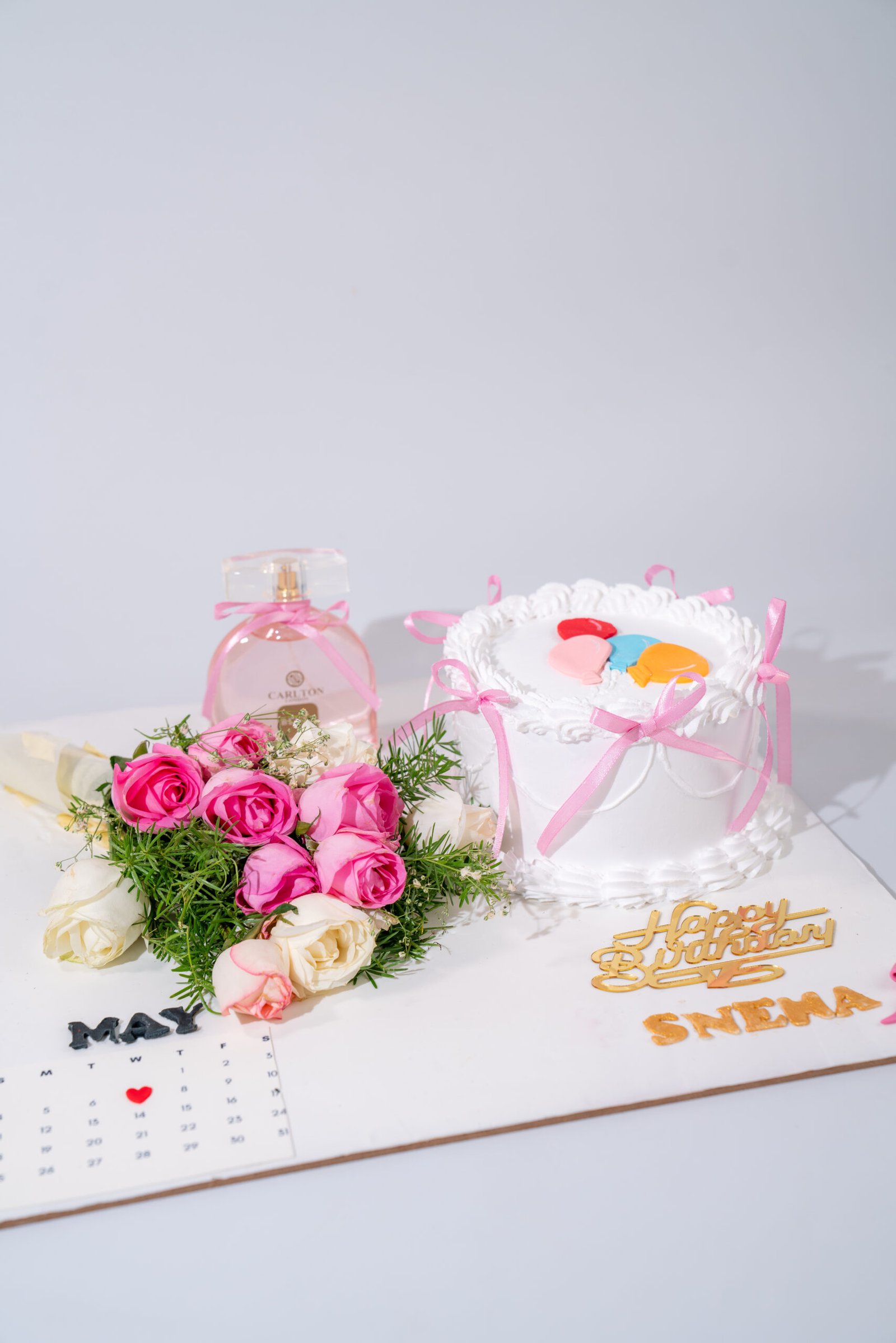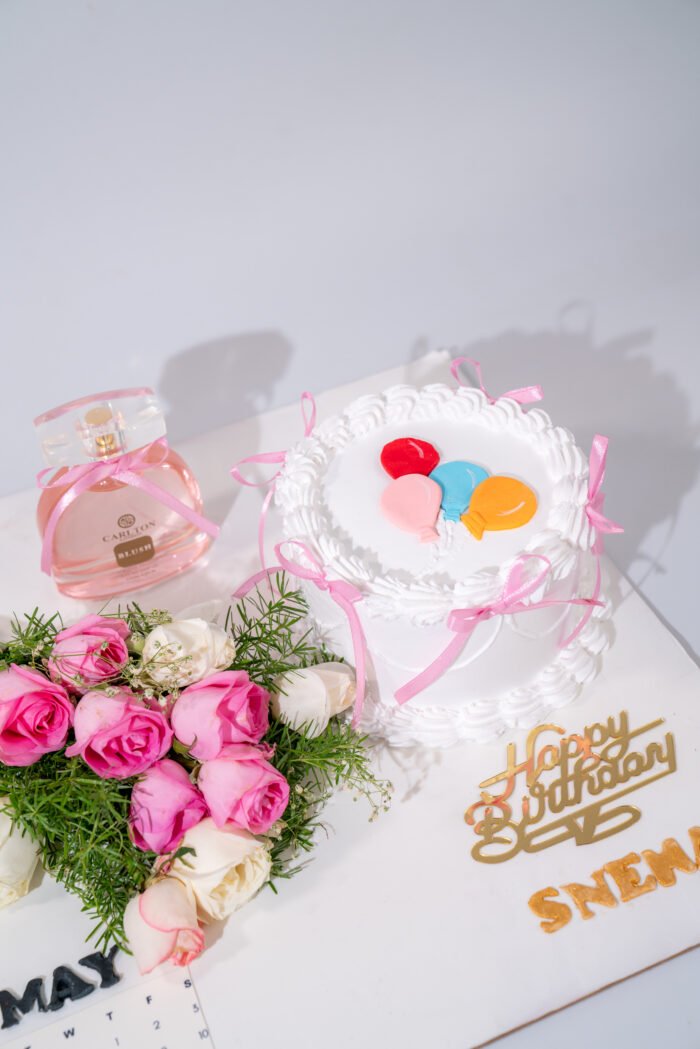 – Frosted White Cake – Decorated with balloon motifs and pink ribbon accents