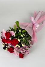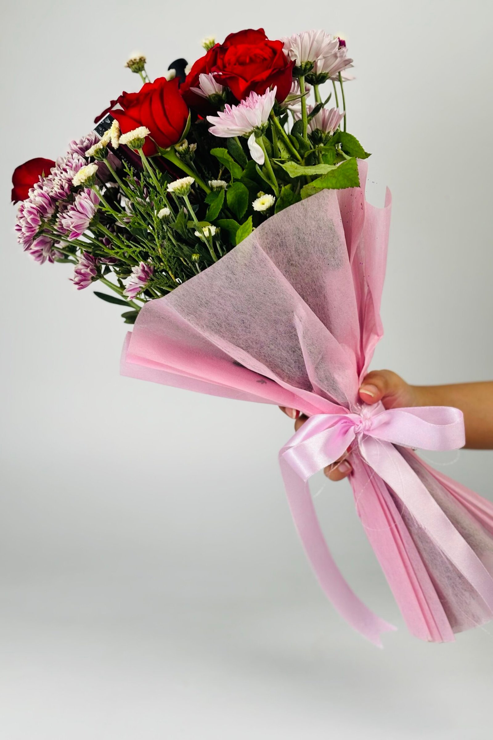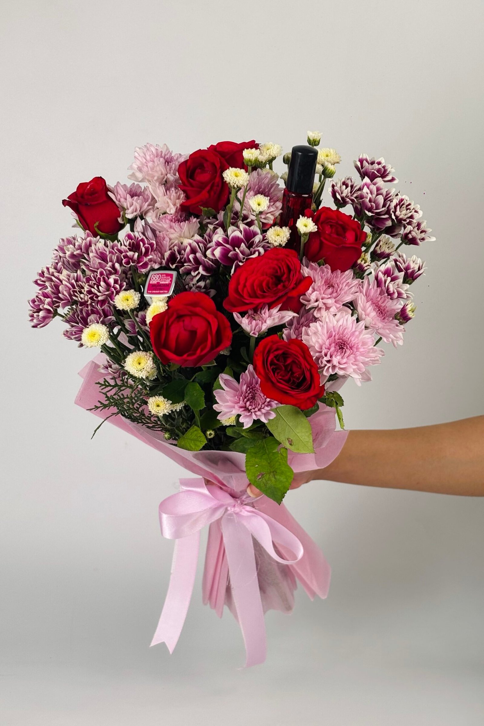 - Premium pink wrapping paper with a satin ribbon tie