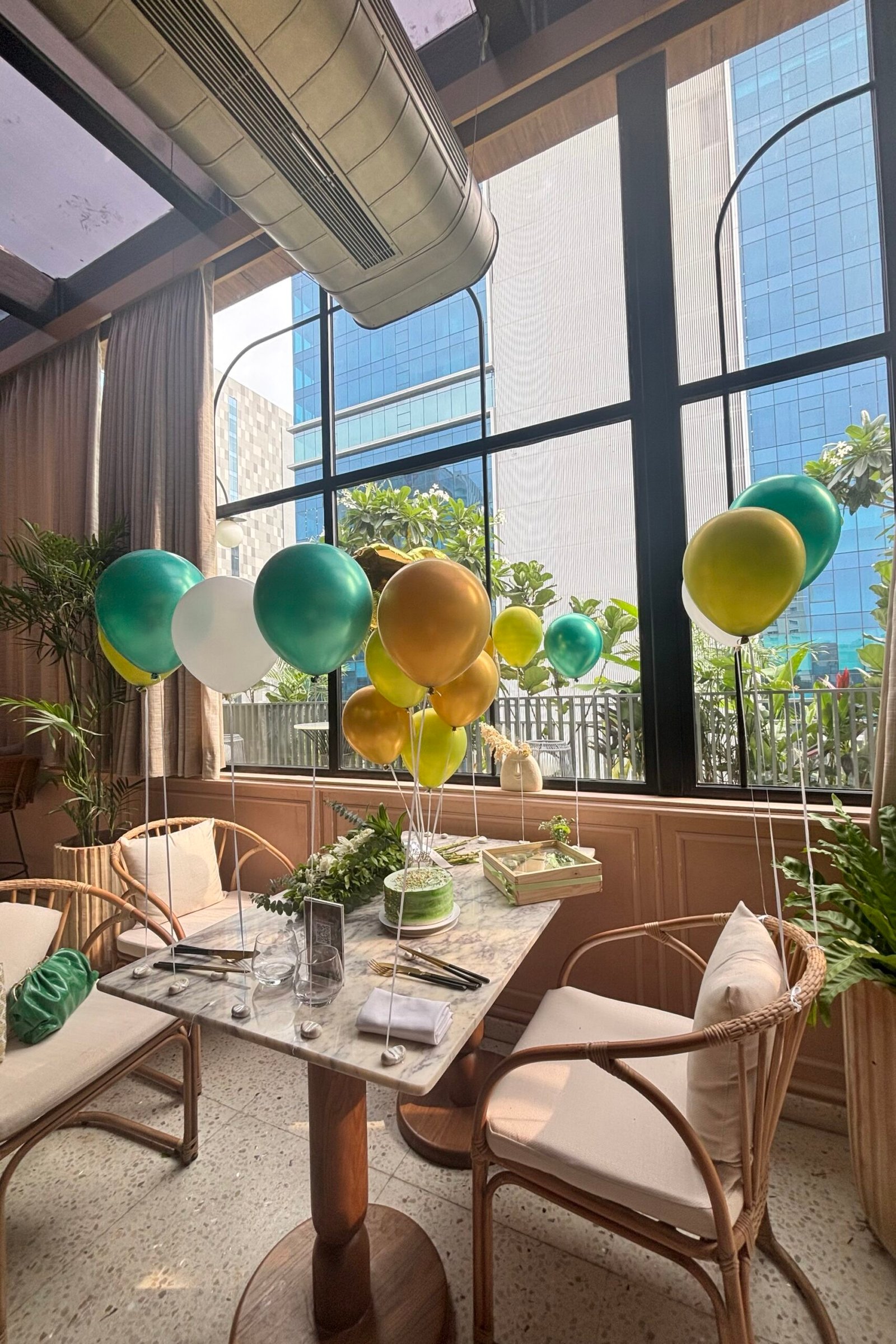 • Styled Table Setup: Elegant table décor with helium balloons to set the celebration mood